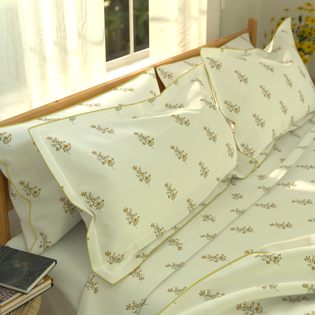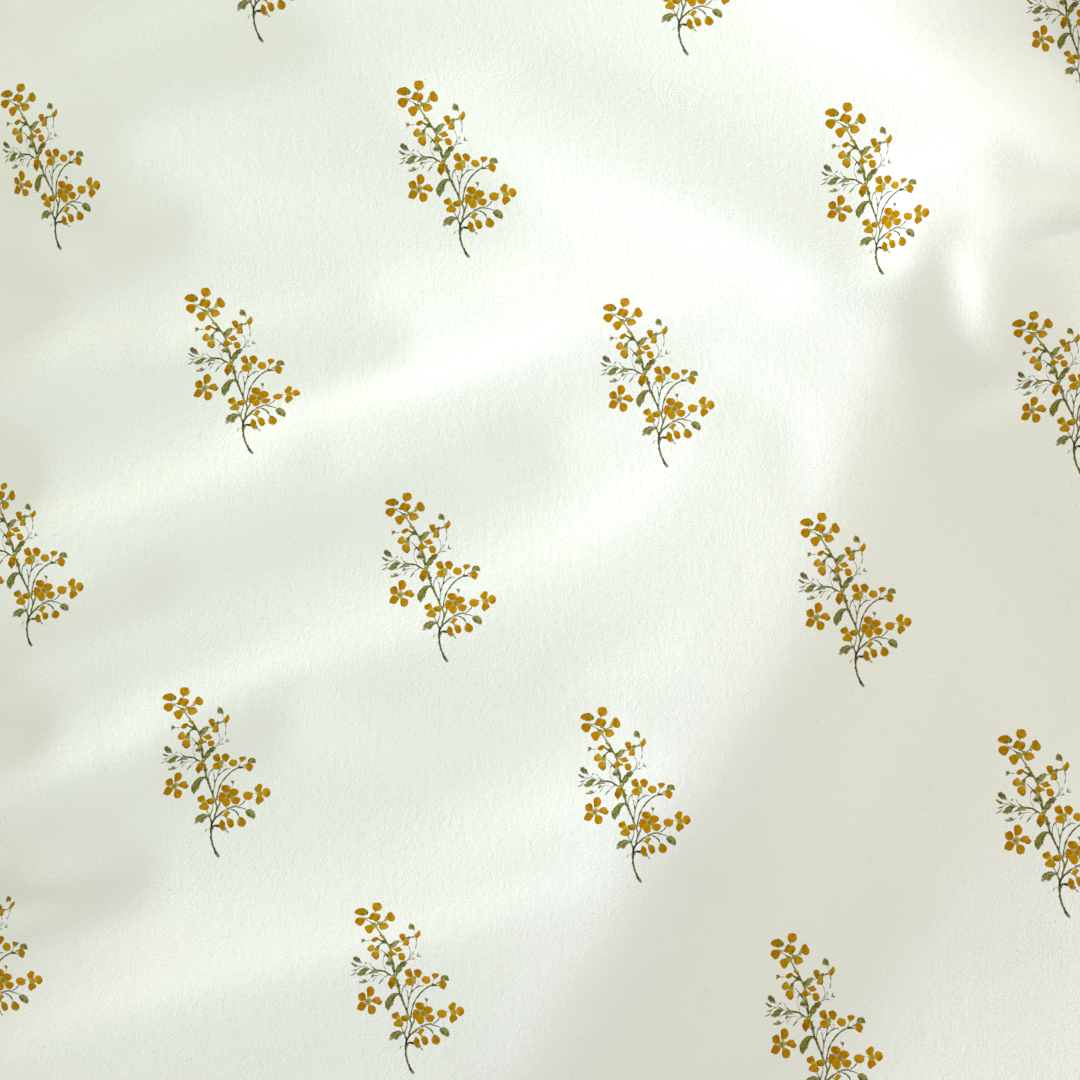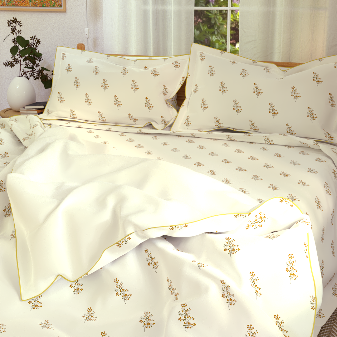 A bright and delightful tradition for the ages, our colorful Fields of Gold Sheet Set features designs inspired by the hand-painted work of local Bangladeshi artisans. The motif makes a statement, printed on a white ground of soft 100% cotton percale or 100% linen.